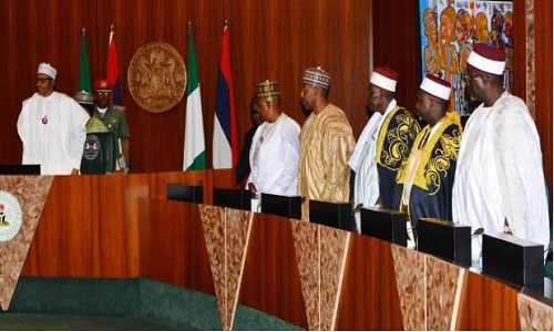 A delegation led by Borno Governor, Kashim Shettima, traditional rulers, elders, national and state assembly members, ?local government chairmen, women groups, the Nigerian Union of Journalists, NUJ, and labour unions, on Monday, presented a letter containing security-related “observations” and ten undisclosed demands to President Muhammadu Buhari at the Presidential Villa in Abuja.